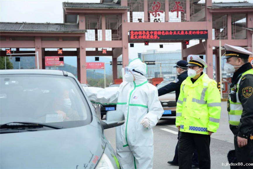 图为刘绪伟在高速路口测量体温