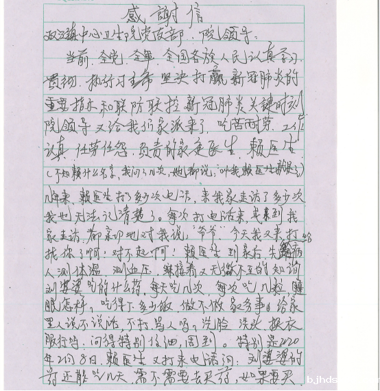 图为重精患者家属写的感谢信