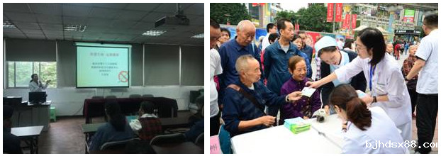 一是发放禁烟宣传资料,向广大病员及家属等宣传吸烟的危害和戒烟的益处。二是张贴禁烟标识,播放禁烟知识和“健康四大基石”视频,传播健康生活方式理念。三是规范戒烟门诊,在患者就诊期间普及戒烟知识,提高公众对烟草危害的知晓率。四是结合健康九龙行大型宣传活动,通过义诊、发放资料等形式普及戒烟知识和戒烟方法,并在周边社区开展禁烟知识讲座,强调二手烟的危害,促进居民戒烟及远离二手烟,提高公众健康意识。