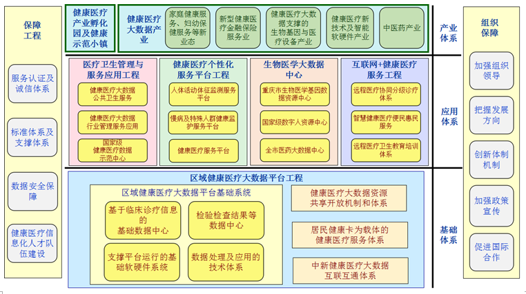 在现有市、区县(自治县)两级人口健康信息平台基础上,依托全市电子政务外网、统一数据共享交换平台和两江国际云计算产业园,全面建立和完善连接国家人口健康信息平台、覆盖全市的人口健康信息平台,以此为基础进一步建成健康医疗大数据平台系统。