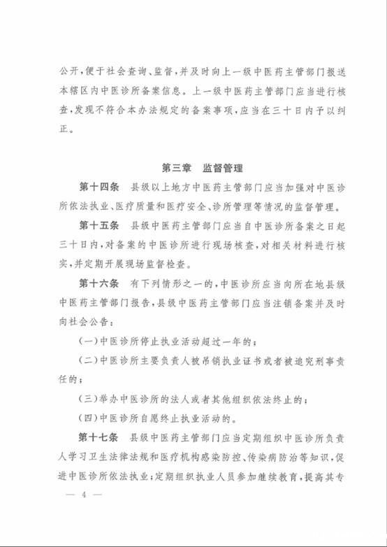 三、依法监管,促进中医诊所健康发展。各区县要认真落实监管责任,按照《中医诊所备案管理暂行办法》的规定,对备案的中医诊所及时开展现场核查,定期开展现场监督检查。要建立中医诊所负责人培训、执业人员继续教育、中医诊所不良执业行为记录等各项管理制度,强化对中医诊所依法执业、医疗质量和医疗安全、诊所管理等情况的监督管理,依法查处违法违规行为,促进中医诊所健康发展,保障人民群众的生命安全和健康。