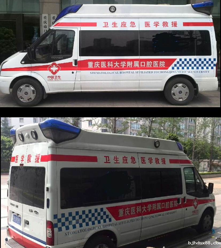 (一) 院前急救救护车外观制式采用白底,由车徽、“120”、“重庆急救”、医院的中英文名称等要素构成。