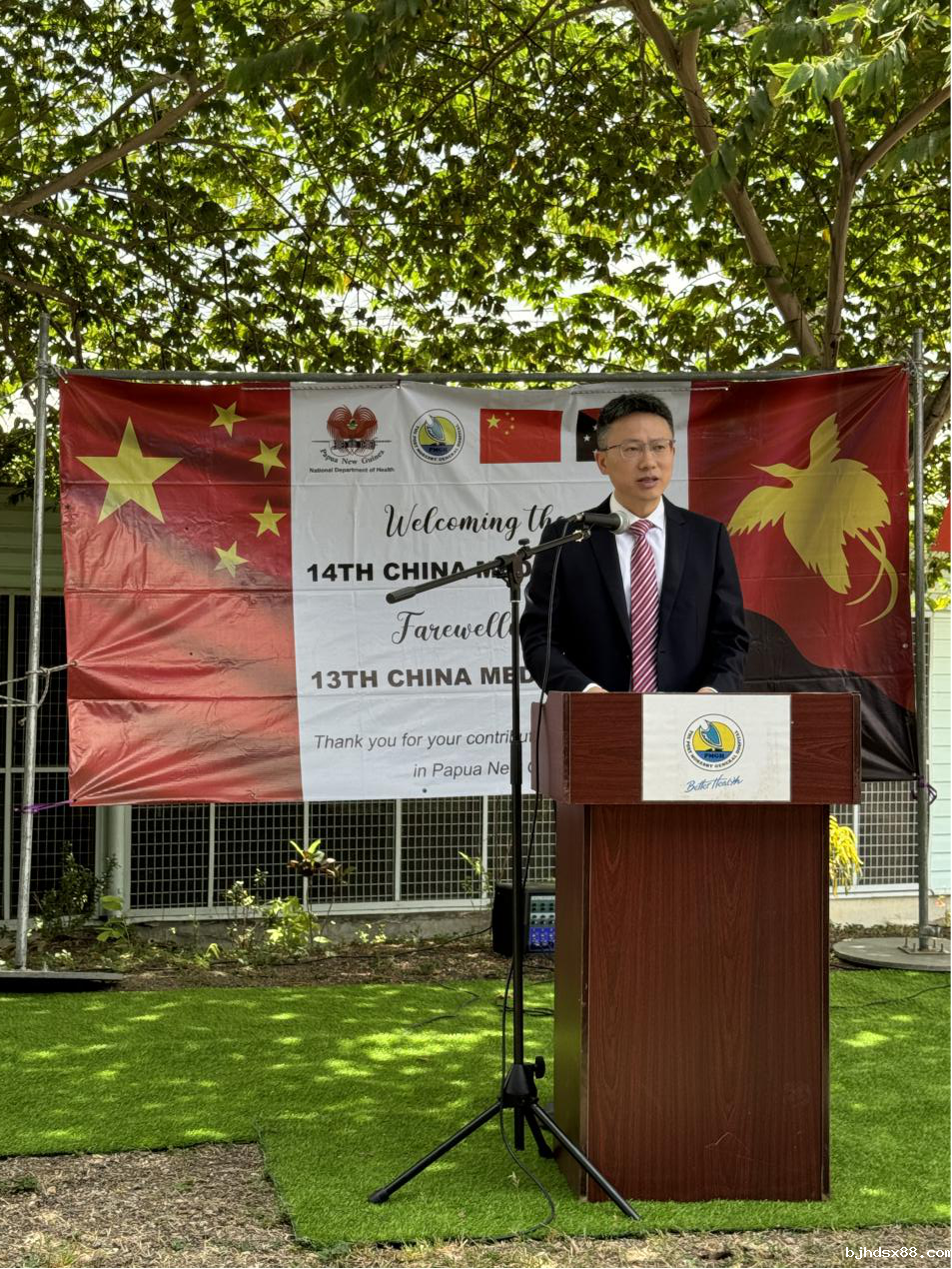 潘建波回顾了第13批援巴新中国医疗队任期工作成果,重庆市与巴新开展的卫生健康技术交流项目,感谢中国驻巴新大使馆,巴新卫生部和莫港总医院对中国医疗队工作的大力支持,勉励第14批医疗队发扬中国医疗队精神,为巴新人民卫生健康事业作出新的贡献!